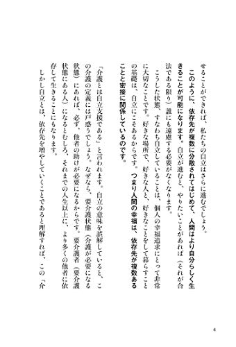 優れた介護においては、要介護者は、この人がいないと死んでしまうという状態、すなわち特定の人への過度な依存が上手に避けられています。